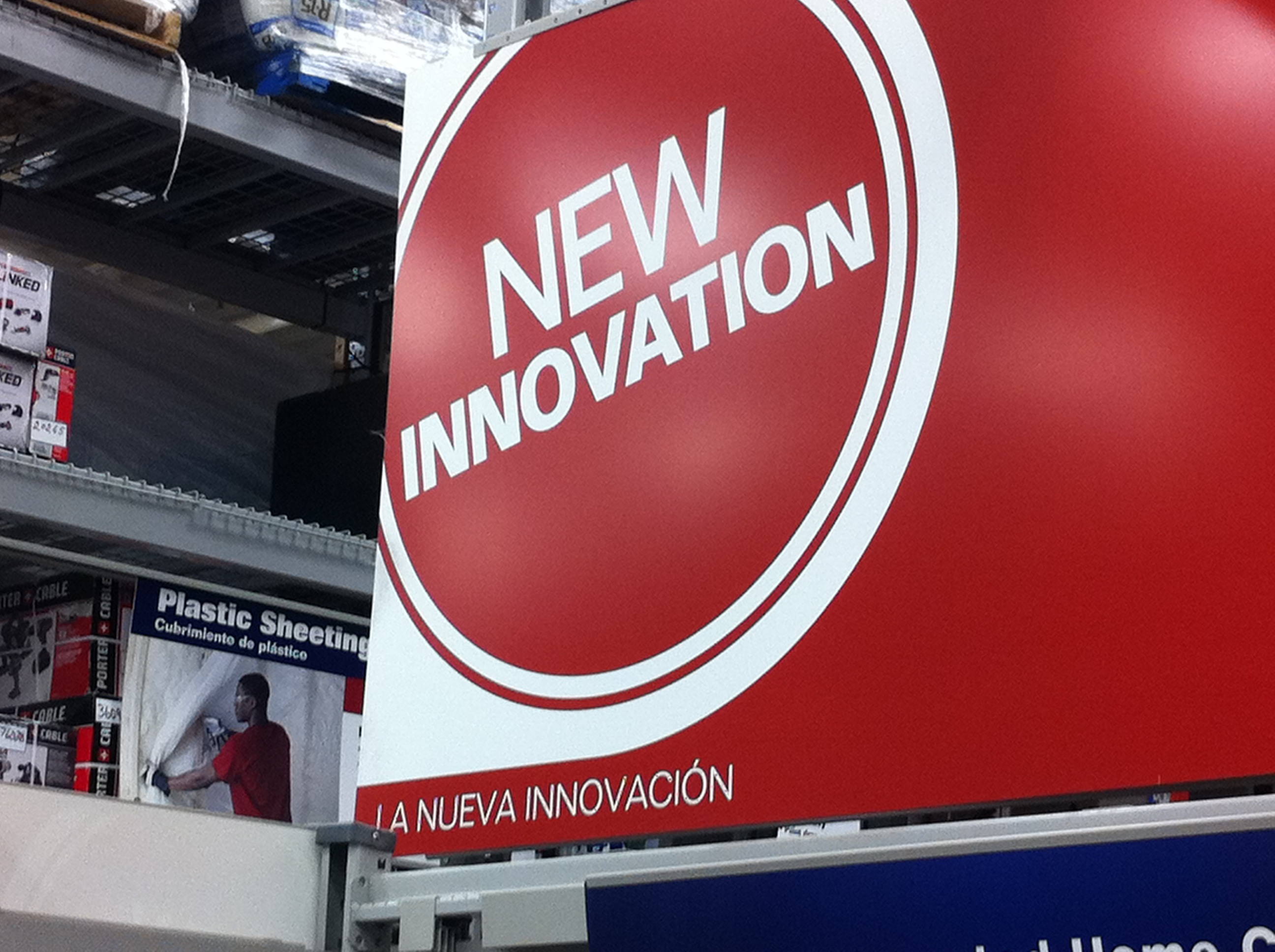 This past weekend, I made a routine shopping trip to Lowe’s. Strolling around the store, I was stunned to see a large poster marking the entry to one of the aisles: New Innovation. My first reaction was that this was a mistake and that the two words belonged to two different writings. But no, below the “New Innovation” in English, there was a version of the same in Spanish: La Nuova Innovacion. Unable to restrain my curiosity, I walked down this particular aisle trying to find any goods deserving such an ambitious description. I found nothing: the aisle was full of the usual stuff–mostly plywood–that I’ve seen there before (unless, of course, I missed some new and highly innovative sizes).