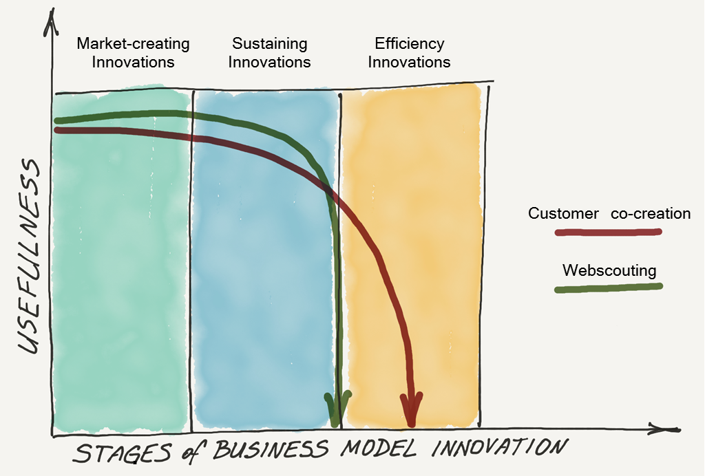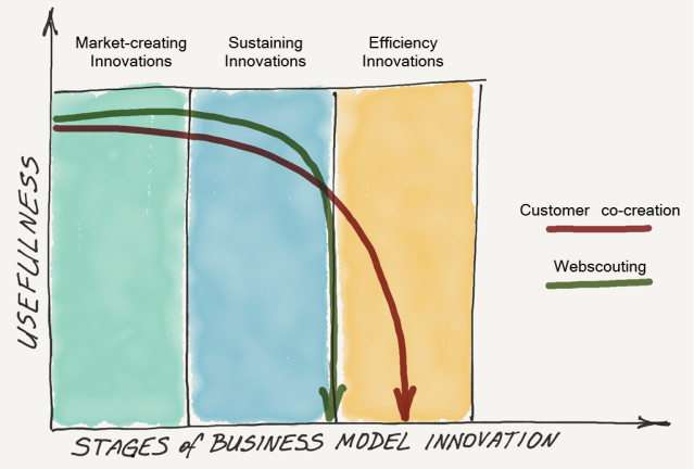 Here, I want to explore a match between stages of business model innovation and two other major open innovation tools: customer co-creation and webscouting.