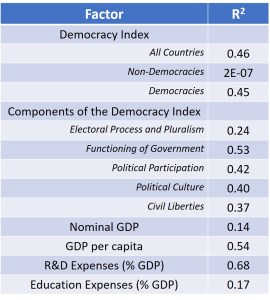 - This correlation is only valid for democratic countries (R2=0.45) but is absent in the case of non-democracies (both groups defined per Democracy Index 2019).