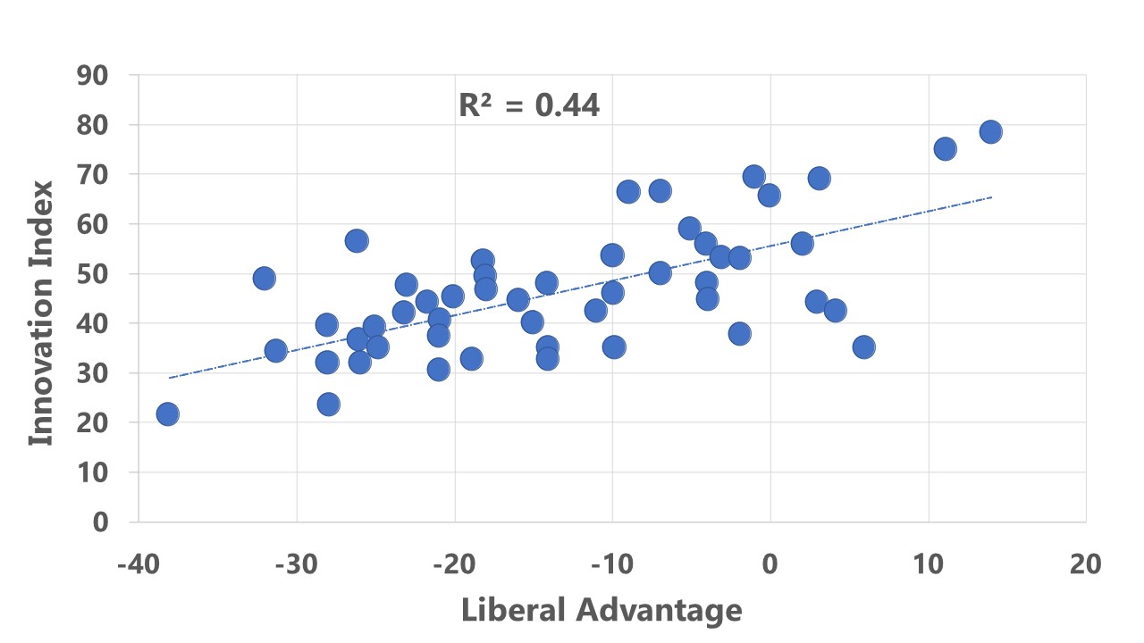 Indeed, there is a reasonably strong correlation (R2=0.44) between the liberal or conservative sentiments in each state and the innovation potential of this state. Liberal states are in general more innovative.