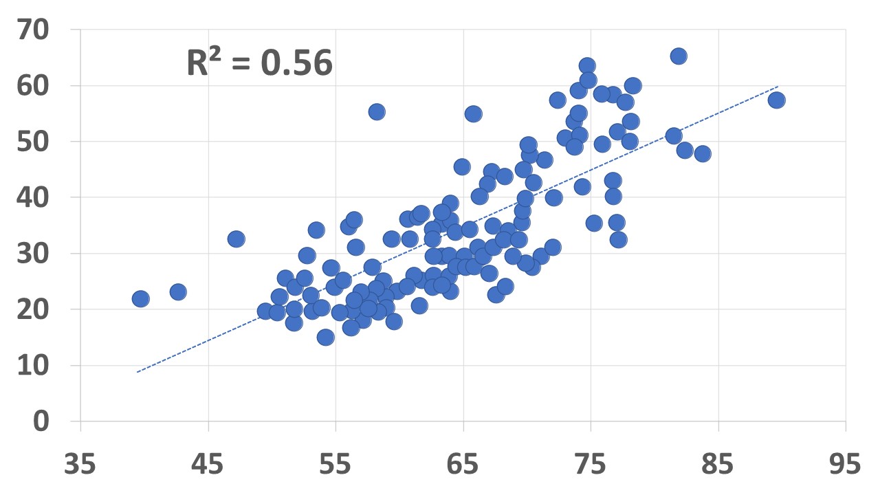 Of course, it was tempting to see to which extent economic freedoms correlate with the innovation potential. For this purpose, I used data from the 2021 edition of the Global Innovation Index (Y-axis) and plotted it against the rankings taken from the 2021 Index of Economic Freedom (X-axis). The results for 129 countries for which both sets of data are available are presented below: