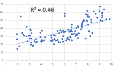 To give this observation some statistical support, I later used the data from the 12th (2019) edition of the Global Innovation Index that analyzed the global innovation performance of approximately 130 economies (Y-axis) and plotted it against the political freedom rankings taken from the Democracy Index 2019 (X-axis). In the latter case, the countries were measured on a scale of 0 to 10.0, marking them as authoritarian regimes (0–4.0), hybrid regimes (4.0–6.0), flawed democracies (6.0–8.0), and full democracies (8.0–10.0).